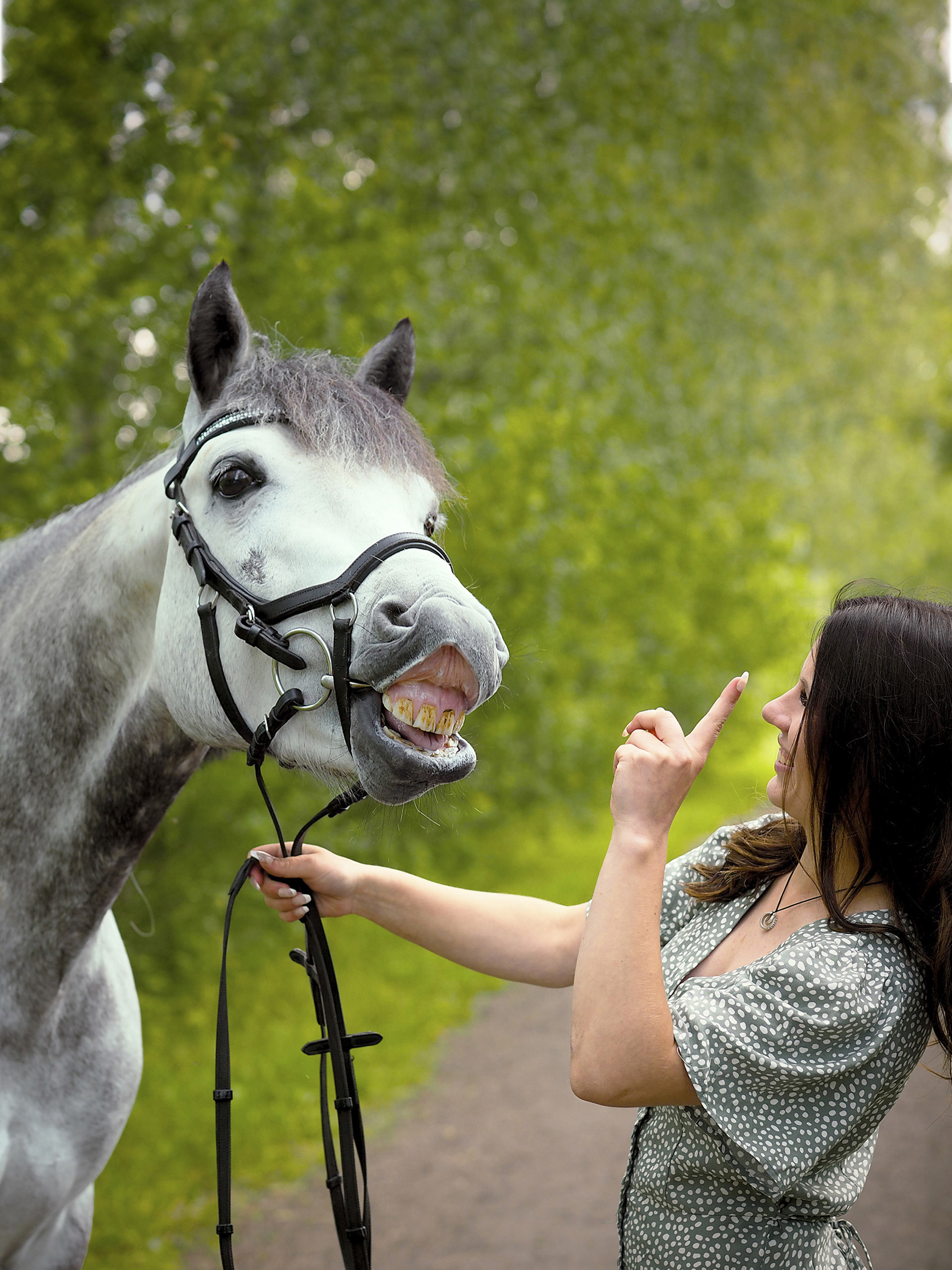 Kuvassa on Hannan tytär Saana yhdessä 5-vuotiaan connemaraponi Batmanin kanssa. Saanan ratsu on opetettu hymyilemään pyynnöstä.