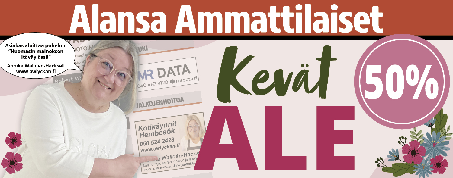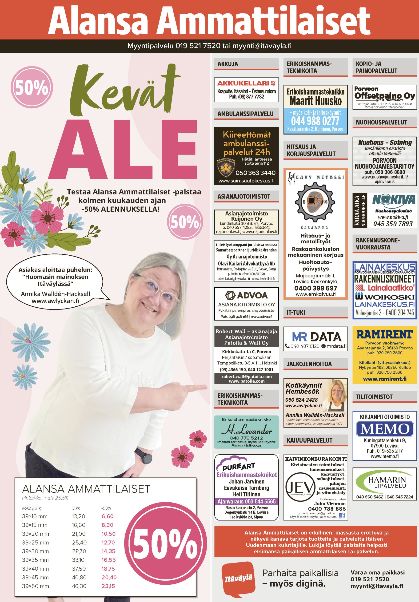 Alansa Ammattilaiset on edullinen, massasta erottuva ja näkyvä kanava tarjota tuotteita ja palveluita itäisen Uudenmaan kuluttajille. Lukija löytää palstalta helposti etsimänsä paikallisen ammattilaisen tai palvelun.